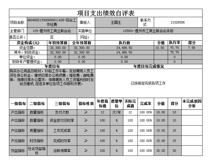 1.综合工作经费项目绩效自评报告:根据年初设定的绩效目标,项目绩效自评得分为7.57分。全年预算数为3.23万元,执行数为2.45万元,完成预算的76%。项目绩效目标完成情况:一是严格按照预算支出进行,控制不必要的支出;二是该项目较好地控制了实施成本,较好地完成了项目支出的节约任务,项目实施正常按计划进行。发现的主要问题及原因:一是预算经费比较少,导致资金支出分类准确性相对较低;二是资金使用没有比较固定,导致分类需调剂,涉及跨大类调剂时间比较长。下一步改进措施:把支付经费细化,尽量做好准确支出分类;二是催促各科室报账加快进度,以便后面支出更加顺畅。