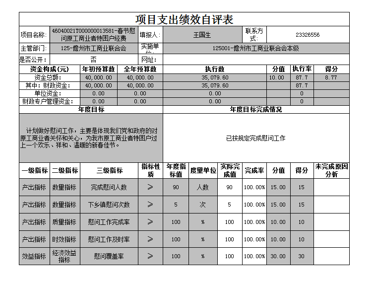 2.春节慰问原工商业者特困户经费项目绩效自评报告:根据年初设定的绩效目标,项目绩效自评得分为8.77分。全年预算数为4万元,执行数为3.51万元,完成预算的88%。项目绩效目标完成情况:一是慰问原工商业者全覆盖,慰问人数100%;二是及时准确把慰问款拨付到慰问对象。发现的主要问题及原因:一是慰问人员比较分散,时间上比较紧;二是没有做到全部上门开展慰问工作。下一步改进措施:一是提前做好慰问准备工作;二是把慰问路线细化,做到全部上门开展慰问工作。