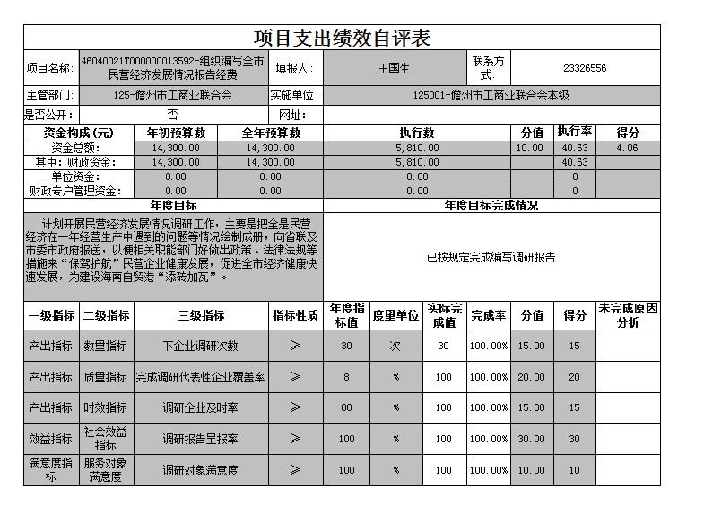 3.组织编写全市民营经济发展情况报告经费项目绩效自评报告:根据年初设定的绩效目标,项目绩效自评得分为4.06分。全年预算数为1.43万元,执行数为0.58万元,完成预算的41%。项目绩效目标完成情况:一是按时完成编写调研报告;二是按计划开展下企业开展调研。发现的主要问题及原因:一是数据深度与广度不足;二是调研样本代表性有限。下一步改进措施:一是多与政府职能部门沟通交流,特别是统计、工商等部门,争取他们给予数据上出支持;二是摸底全市具有代表性的民营企业,多与这些企业打交道,了解企业在生产经营过程中遇到的问题。