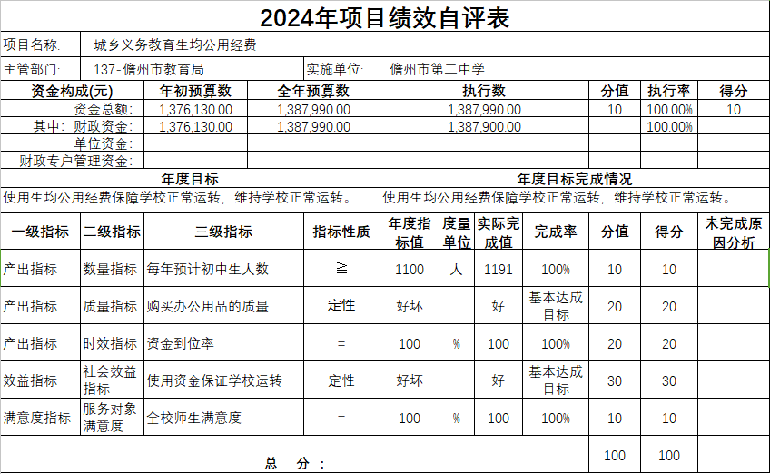 城乡义务教育生均公用经费项目绩效自评报告:根据年初设定的绩效目标,项目绩效自评得分为100分。全年预算数为138.79万元,执行数为138.79万元,完成预算的100%。项目绩效目标完成情况:一是资金到位率为100%;二是使用资金保证学校运转。发现的主要问题及原因:一是无;二是无。下一步改进措施:一是无;二是无。