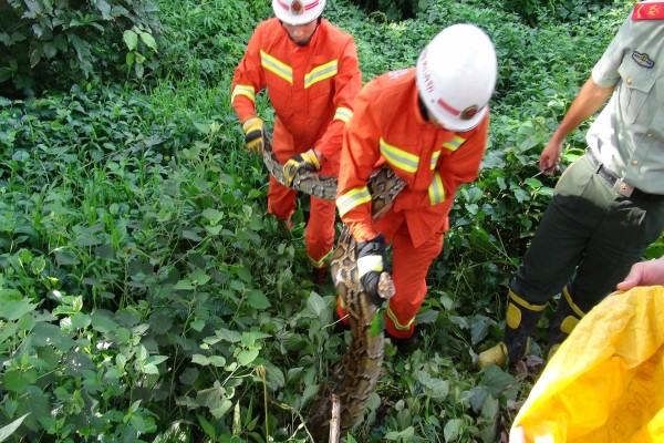 消防官兵解救被困在养猪场的一条大蟒蛇。