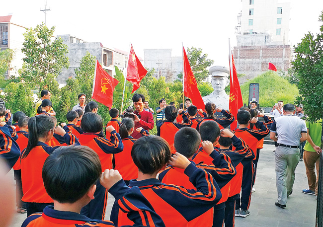 10月25日下午,白马井镇举办潘江汉将军诞辰101周年纪念活动。图为少先队员、共青团员在潘江汉将军墓前集体宣誓缅怀革命前辈遗志。陈灿麟 摄