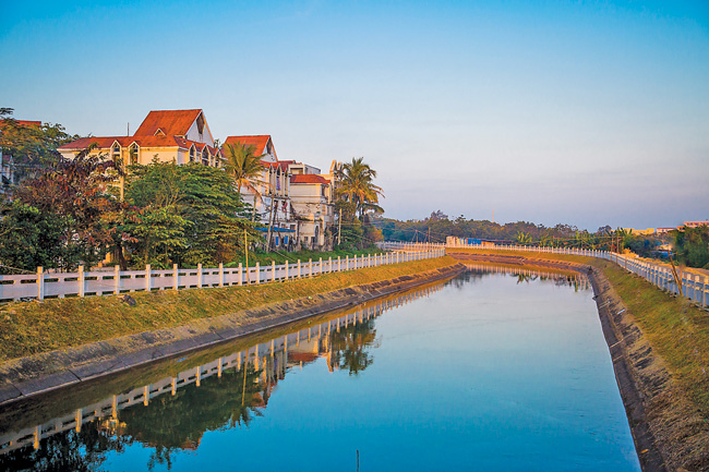 据《今日儋州》消息 晨曦的银河公园,金黄色朝阳洒落栈道上,平静的水面银光闪动,如画般美不胜收,成为了市民休闲晨练的好去处。银河公园项目总投资逾3.28亿元,围绕那大绕城河建设,范围东至迎宾大道以东,西至松涛东干渠闸口,贯穿那大城区,全长13.6公里,面积约110.22万平方米。图为银河公园军屯东坡路段。(记者何文新 摄 编辑朱建花)