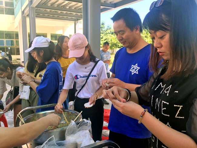 当天,志愿者们带着月饼、水果和日常生活用品等走进了敬老院,为老人们送来中秋的问候。待安排老人们坐好后,志愿者为其端上了水果,并开始为他们进行歌舞表演。“我给大家唱首广东的经典老歌”“我们给你们来段儋州调声表演”“《社会主义好》,有没有会唱的,我们一起来唱……表演中,志愿者们不时地与老人们互动着。而在院子里, 部分志愿者正忙着包饺子,待煮熟后,还陪着老人们一起吃饺子,让老人们感受到了“中秋·团圆·家”的亲情和幸福。