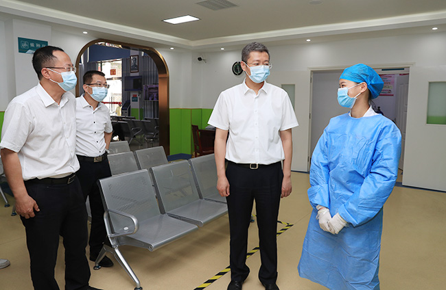 3月30日,市委副书记、市长邹广到那大镇卫生院、海南西部中心医院南院区新冠疫苗接种点,检查指导疫苗接种工作并慰问一线工作人员。图为邹广在那大镇卫生院了解疫苗接种进展情况。