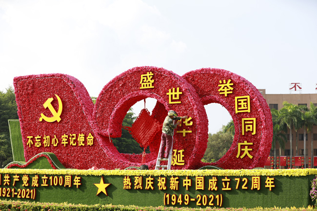 在市政府广场前,花坛设置格外醒目,花坛以中国共产党成立100周年为主题,花坛绿雕的创意造型元素以100数字设计成一艘红船,有乘风破浪、扬帆远航、勇往直前之意,同时与山形水体元素、中国结、党徽、标语结合。花坛绿雕中轴线两侧以花桥、扇形花墙、圆形花柱做配景。花桥加上“学党史、悟思想、办实事、开新局”12个大字,扇形花墙也加上“共产党万岁”“人民万岁”等红色字体,总体设计表现出建党100周年继往开来的新局面。