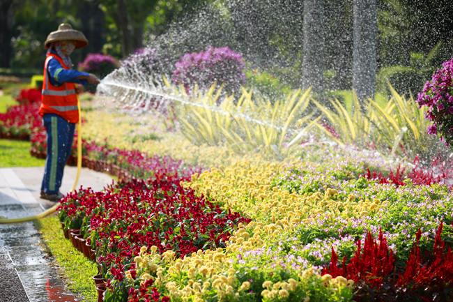 图为园林工人在给市政府广场摆放的鲜花浇水。儋州融媒全媒体记者 何文新 摄