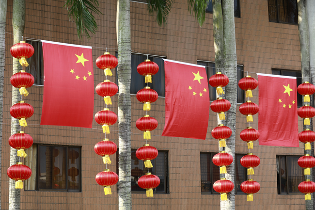 文化路灯杆插上一面面鲜艳的五星红旗。