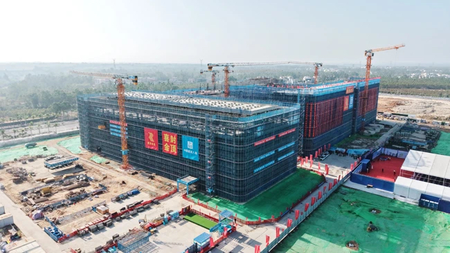 近日,记者在润泽自贸港国际信息港项目现场看到,主体建筑已拔地而起,工人正在各自岗位上有序工作。