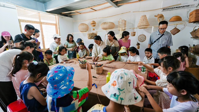 研学队伍来到本次研学最后一站中藤公司,展厅内的藤编作品令人目不暇接:精致的收纳篮、灵动的摆件将天然藤材与现代审美完美融合,文化墙则清晰呈现藤编从选材到成品的完整流程。工作人员现场示范挑、压、编、织等基础技法,市民游客手持藤条认真模仿,在指尖翻动中感受传统技艺的精妙,传承非遗韵。