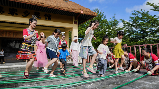 研学首站聚焦黎乡文化根脉。市民游客走进黎家乡愁馆与黎陶文化馆。馆内展陈的古老器具、图文史料系统勾勒出黎族先民的生活轨迹,讲解员结合展陈内容细致讲解,让大家对黎族文化有直观的认识。在竹竿舞体验环节,黎族同胞手持竹竿敲出明快节奏,“叮咚”声中,游客们跟着示范在开合间隙跃动,尽管起初脚步生疏,
