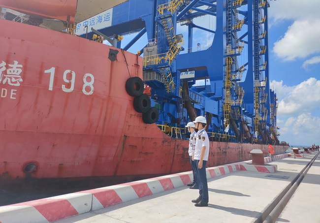 在此次重大件滚装作业中,洋浦海事局严格落实“洋浦国际集装箱枢纽港全链条服务举措”,秉持“监管与服务并重”理念,实施全流程精准护航。通过前置宣贯船舶靠泊、明火作业等安全法规,强化作业单位主体责任;动态跟踪气象海况,研判潮汐情况,科学选定作业窗口期;派驻海事执法人员现场驻守,运用无人机巡航、船舶AIS监控构建远程监管网络,实现“线上+线下”协同,确保作业安全高效。