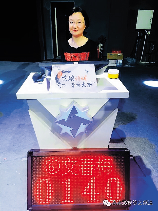 文春梅 “中国海南海花岛杯——东坡诗词背诵大赛”总决赛十二强选手——文春梅,温婉优雅,作为一家文化公司的品牌总监,阅读、旅游、诗词、音乐都是她的兴趣爱好。 文春梅不但自己喜欢诗词,还有一个同样喜欢诗词的伴侣。她和爱人携手吟诗唱和,互诉喜怒哀乐。东坡先生的《定风波·莫听穿林打叶声》是她最喜欢的一首词。一句“莫听穿林打叶声,何妨吟啸且徐行。”表达了东坡先生悠闲从容、旷达乐观的生活态度。文春梅说,这也是她和爱人共同追求的人生境界。 文春梅参加本次诗词背诵大赛,原因甚是浪漫。用她的话说,是“代夫出征”。她爱人喜爱诗词,但因故不能参赛,所以她决定代替爱人圆参加诗词背诵大赛的梦。由此,也能看出文春梅夫妇一往情深、情趣相投。