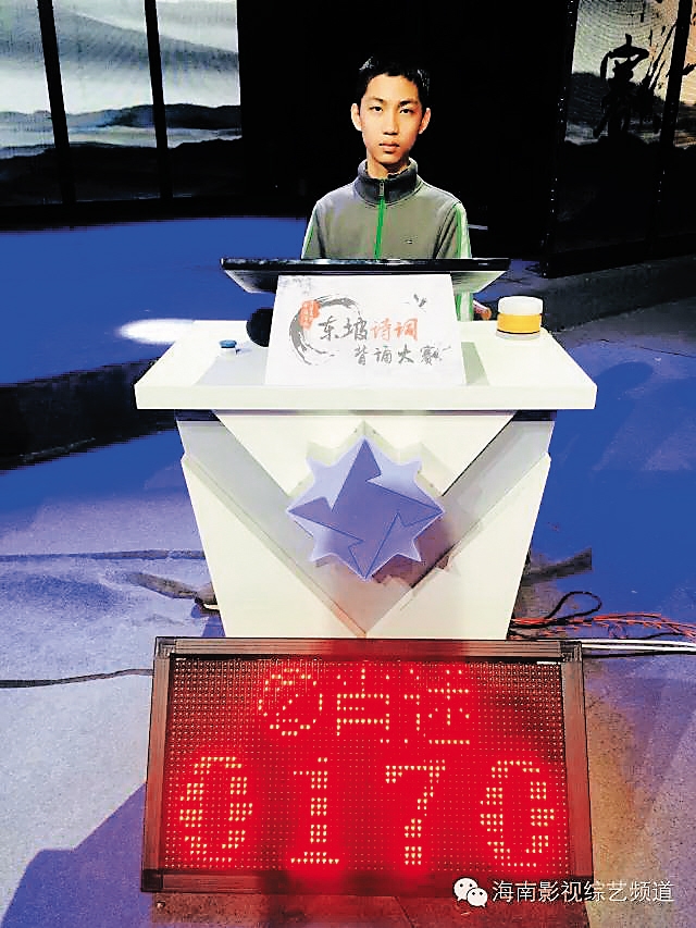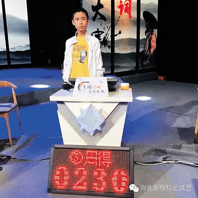 周得 “中国海南海花岛杯——东坡诗词背诵大赛”总决赛选手周得,年仅11岁,是入围决赛的12名选手中年龄最小的。虽然年纪不大,但他以总分230分的小组最高进入总决赛。 周得从小就学习传统文化,除读书写字外,他也跟同龄孩子一样喜欢嬉闹玩耍。不过,准备本次大赛,周得刻苦练习,每天背诵东坡诗词长达9小时。他在复赛中的精彩表现,可谓是天道酬勤。 周得记性非常好,说起他最喜欢的一首东坡诗词——《欧阳少师令赋所蓄石屏》,他随口就来:何人遗公石屏风,上有水墨希微踪。不画长林与巨植,独画峨眉山西雪岭上万岁不老之孤松。崖崩涧绝可望不可到,孤烟落日相溟濛。含风偃蹇得真态,刻画始信有天工。我恐毕宏韦偃死葬虢山下,骨可朽烂心难穷……