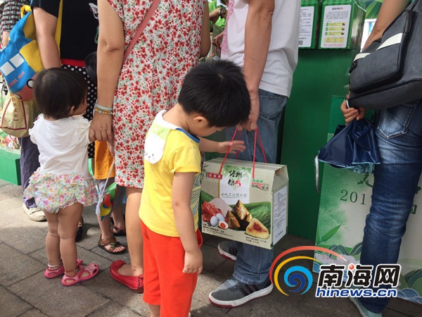 “2017中国·海南名粽展销会”现场,市民排队选购粽子时,跟随父母逛展的孩子表现出对粽子的喜爱。