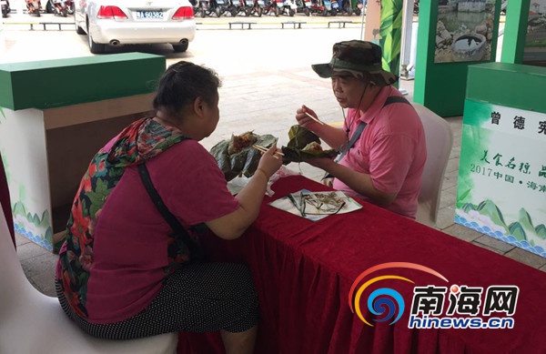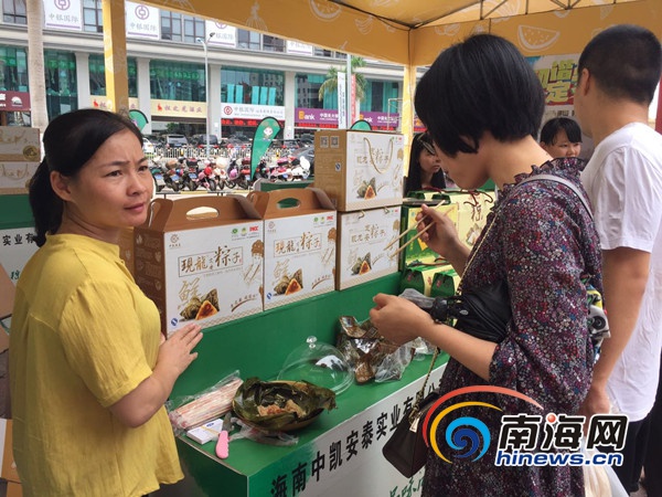 “2017中国·海南名粽展销会”现场,定安展商一边邀请市民品尝,一边向其介绍自家粽子的特点。