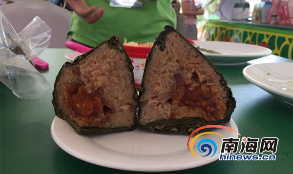 “2017中国·海南名粽展销会”现场,展商不断切开不同口味的粽子吸引观展市民前来选购。