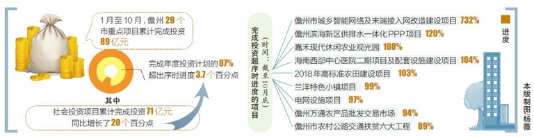 儋州市重点项目办主任莫运维说,今年1月至10月,儋州固定资产投资中社会投资表现抢眼。29个市重点项目中,政府投资项目累计完成投资18亿元;社会投资项目累计完成投资71亿元,同比增长了20个百分点。