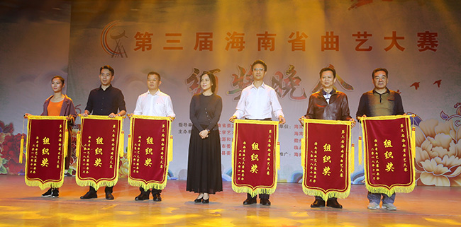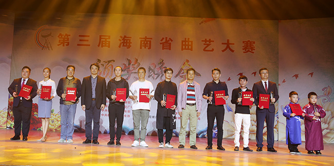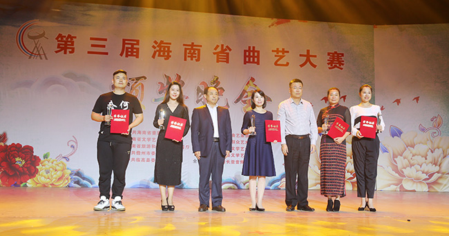 副市长吴波、省旅游和文化广电体育厅社会处处长肖辉为荣获第三届海南省曲艺大赛一等奖作品颁奖。